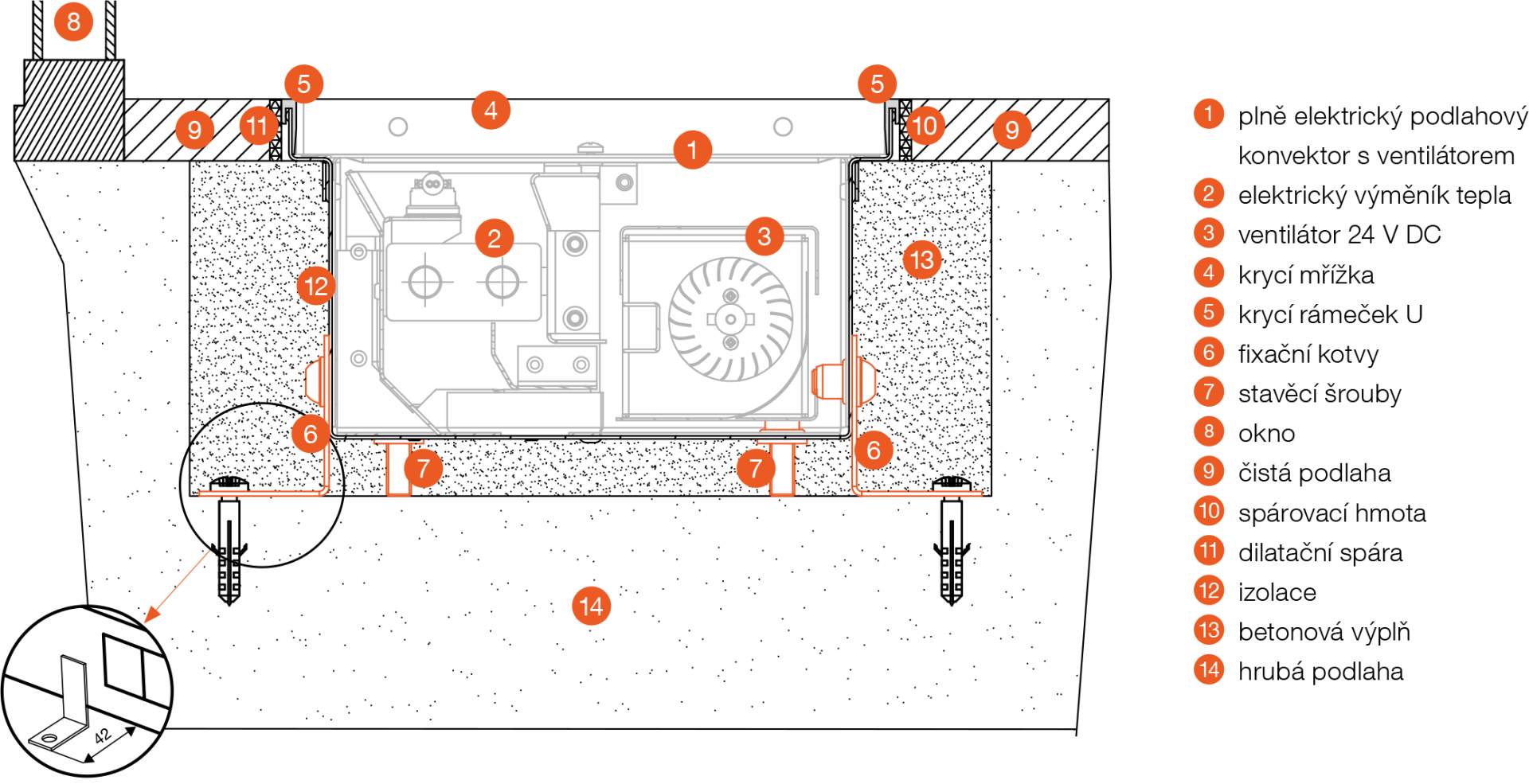 - Při použití fixačních kotev se rozšiřuje spodní šířka konvektoru o 42 mm z každé strany.