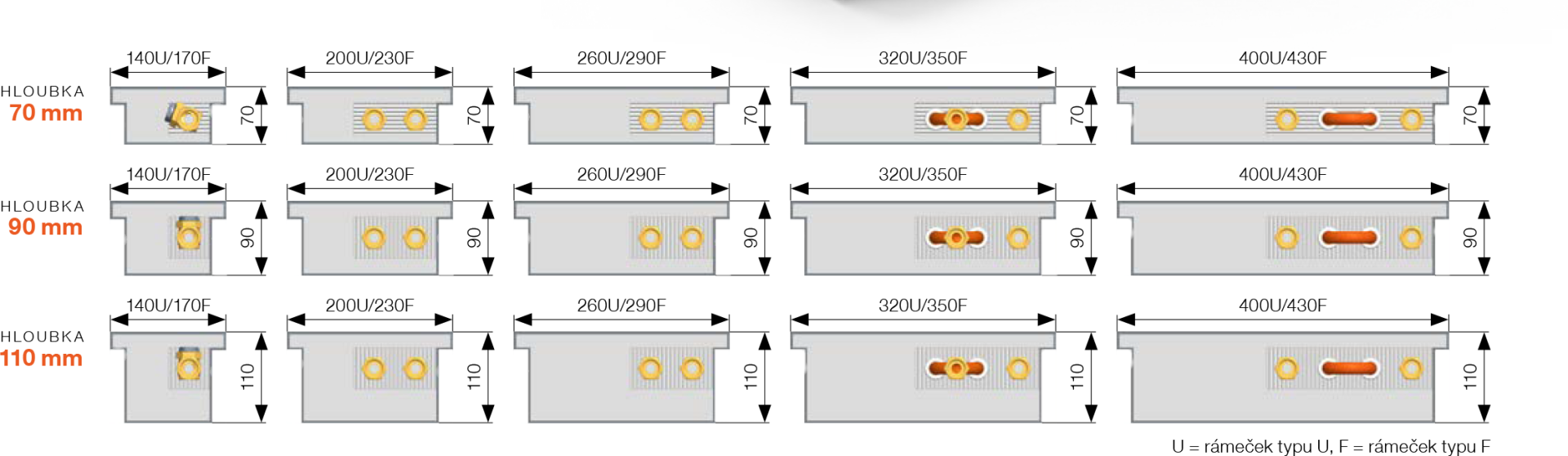 • Doporučený rozměr zástavbového otvoru v podlaze by měl být větší minimálně o 100 mm na délku i šířku, než je rozměr konvektoru.