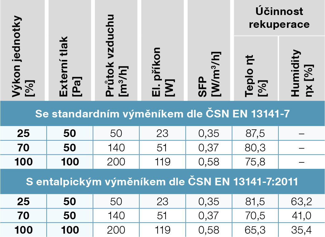 | Účinnost přenosu tepla/Průtok vzduchu | 75,8 % / 200 m³/h; 80,8 % / 140 m³/h; 87,5 % / 50 m³/h |