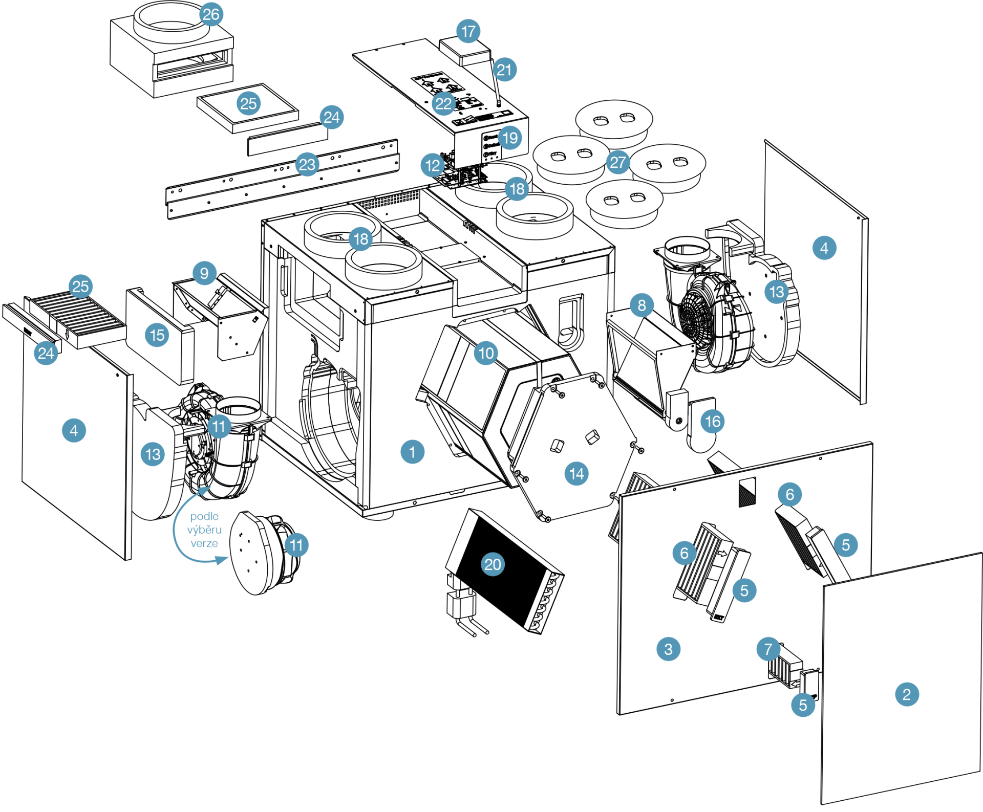 | Standardně je jednotka dodávána s deskovým protiproudým výměníkem tepla (HRV). | |
