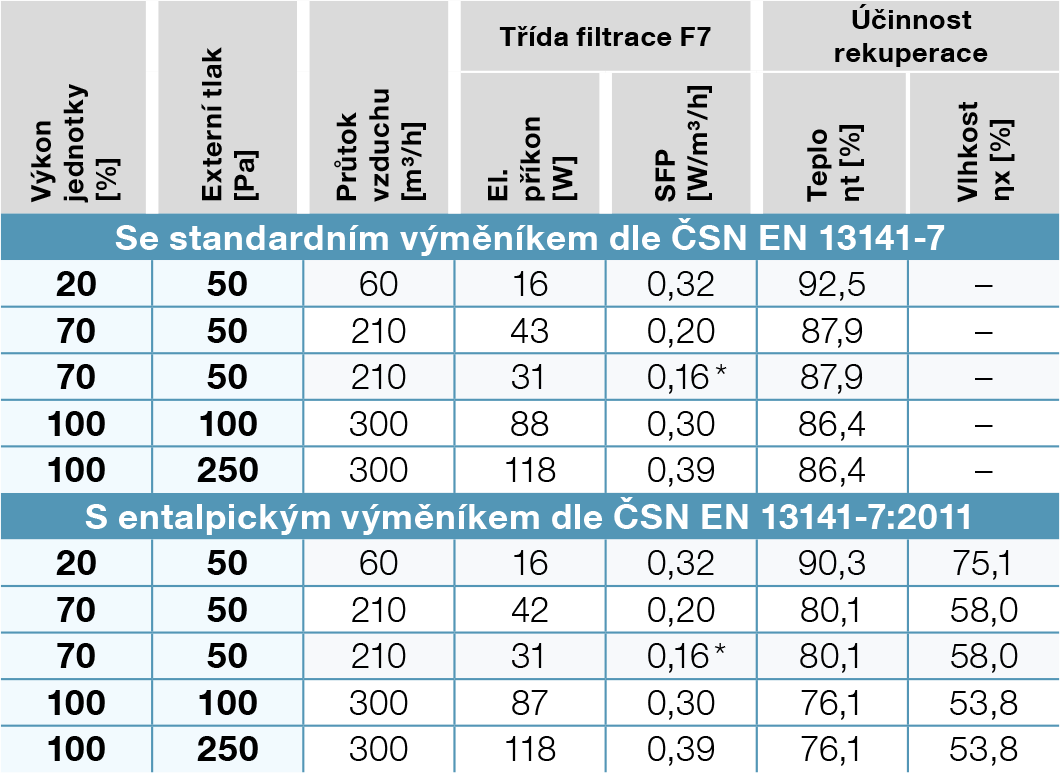 | Účinnost přenosu tepla / Průtok vzduchu | 86 %/300 m³/h; 88 %/210 m³/h; 93 %/60 m³/h |